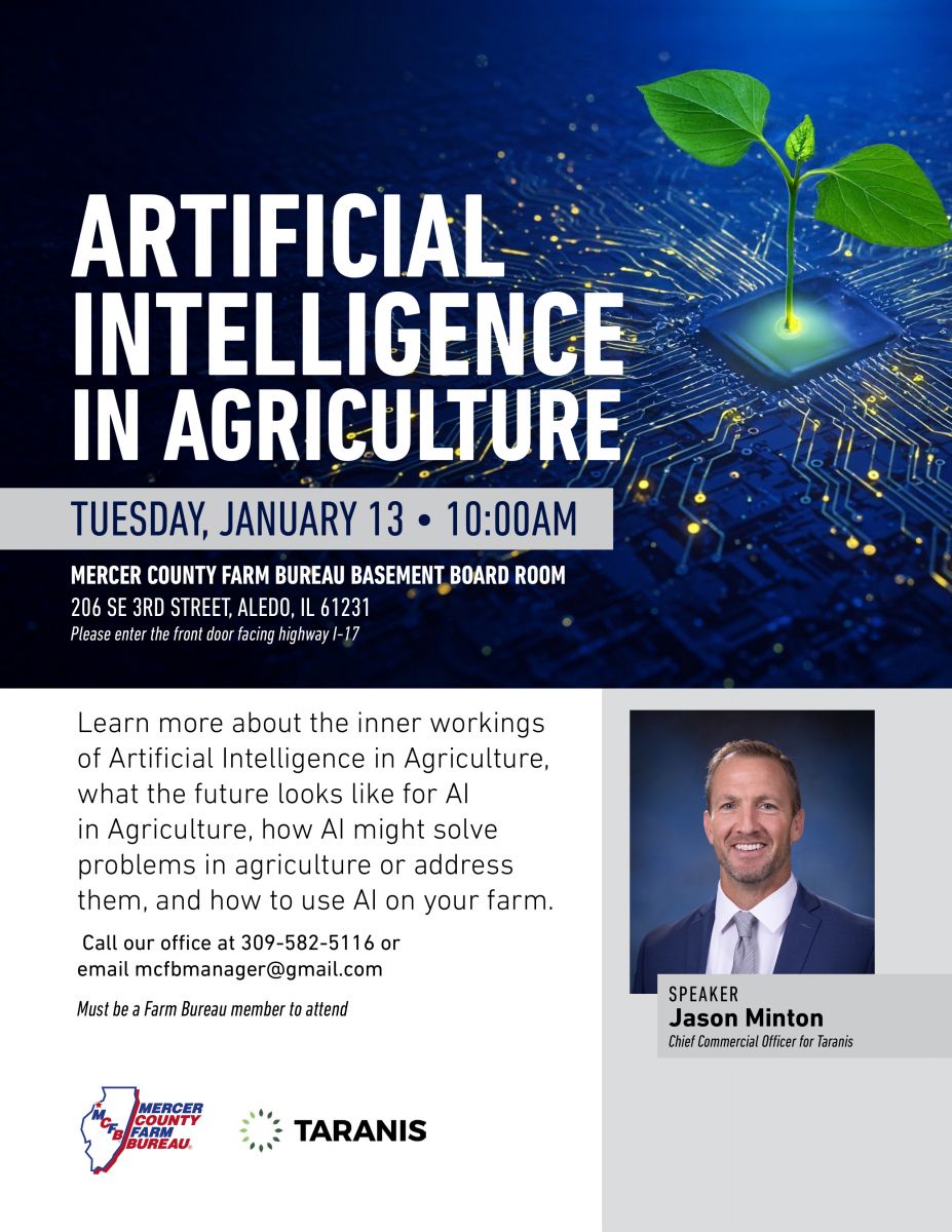 Join us on January 13th to learn about Artificial Intelligence in the Agriculture world. Jason Minton, Chief Commerical Officer for Taranis, will be speaking. RSVP by January 9th! You must me a farm bureau member to attend.